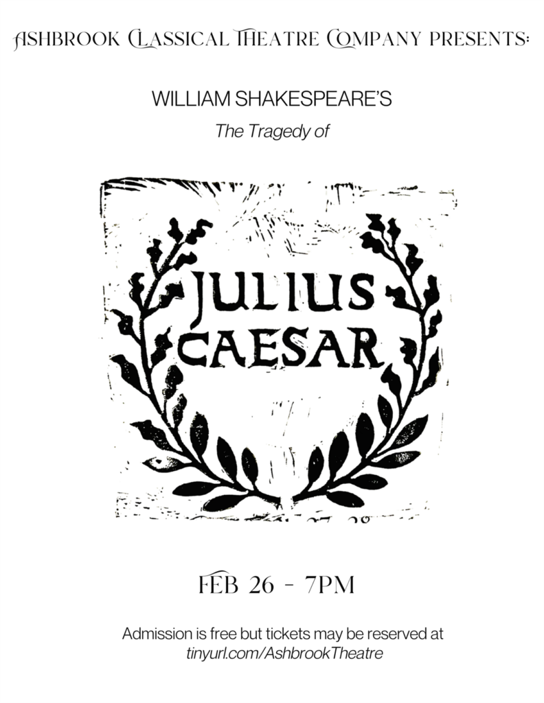 The Ashbrook Classical Theatre Company is proud to present William Shakespeare’s classic play, Julius Caesar. Admission is free, general seating.