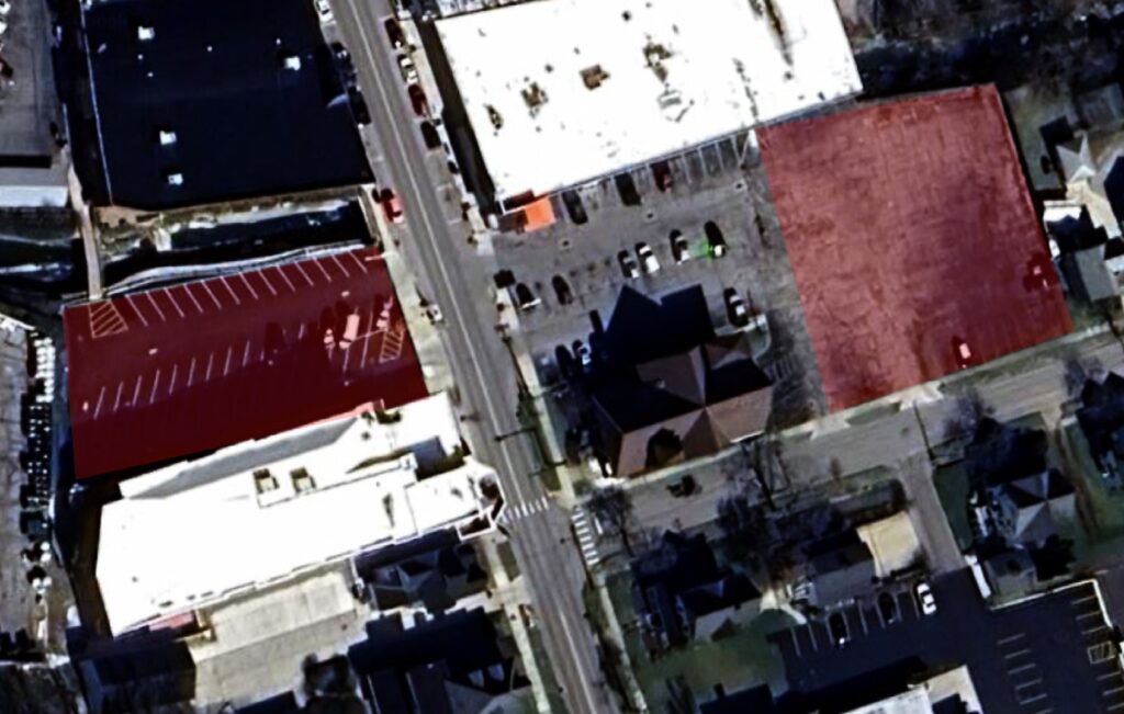 The main parking lot for The Ashland Theatre is adjacent to the building. In the event that the lot is full, Save-A-Lot very graciously allows our patrons to park in their lot, on the condition they park in the back area of the lot. (Highlighted in red, right side of image.)